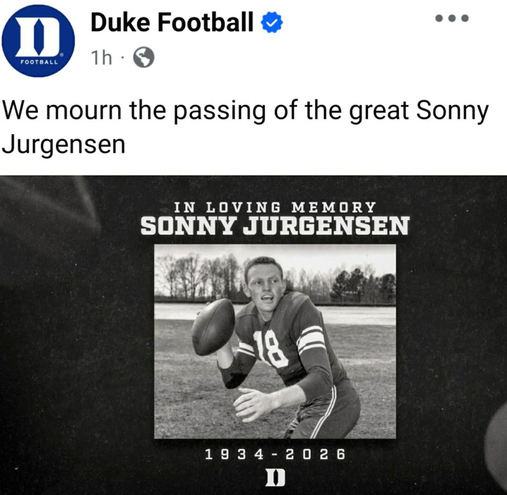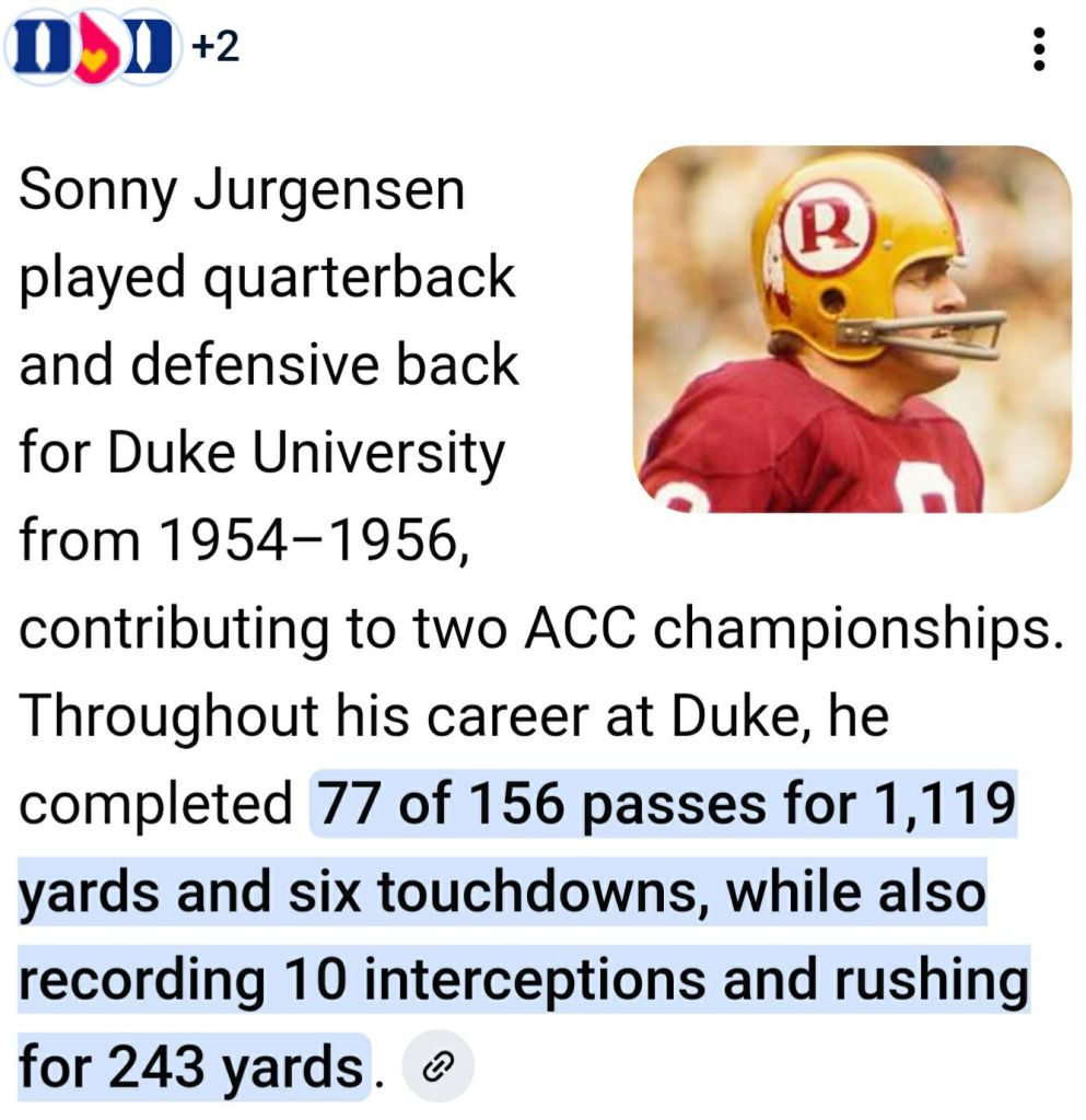 Most people simply don’t connect Jurgensen with Duke University Football because Sonny played at a time when players went both ways.