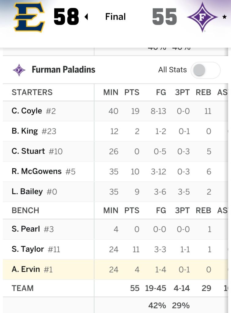 Nine β minutes into the contest last night Furman was still searching for its first made basket π§Ί.