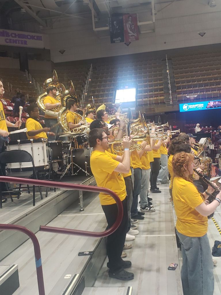 We are about 8 feet from the court and less than that from the Mocs Band & Cheerleaders.