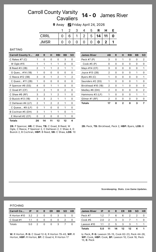 The combination of Carroll County hitting the ball hard all night and shaky glove work by the home team eventually allowed the Lady Cavaliers to post a comfortable 14 – 8 victory. Galax will travel to The Hill on May 4th in hopes of earning a split in the season series.