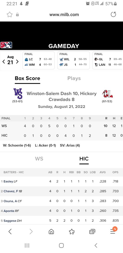 On my way to the Charlotte Airport I did a quick check of the local schedules and found home games for three teams in the region. The Hickory Crawdads (3pm) and the Knights (5:05). In Gastonia the Honey Hunters get underway at 4:15. Winston-Salem is the visitors in Hickory for today’s version of a different kind of a tripleheader.