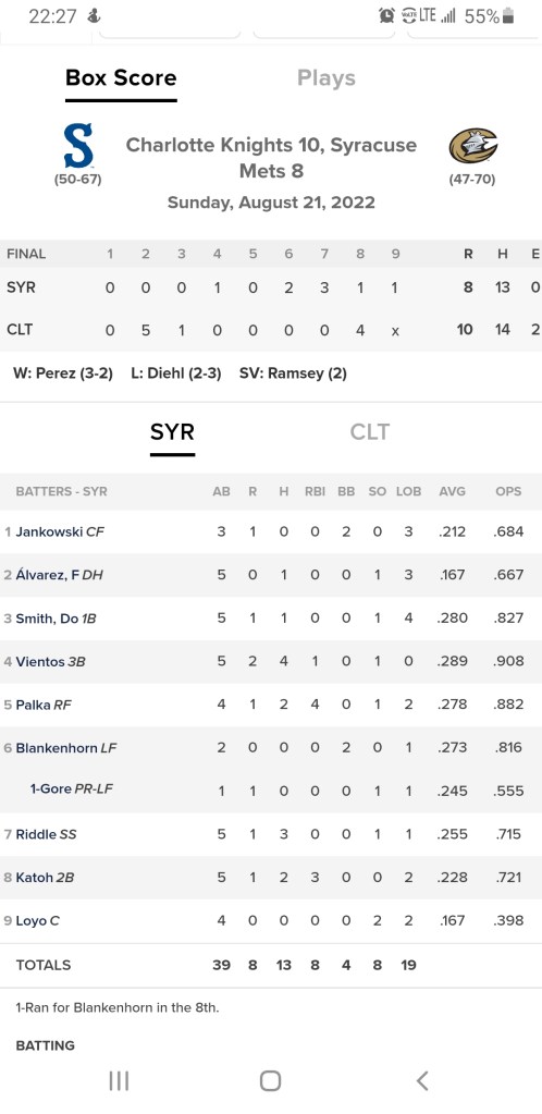 Unlike the two previous games where the visitors jumped out to big leads, the Charlotte Knights were sailing along with a 6-0 lead over the Syracuse Mets.