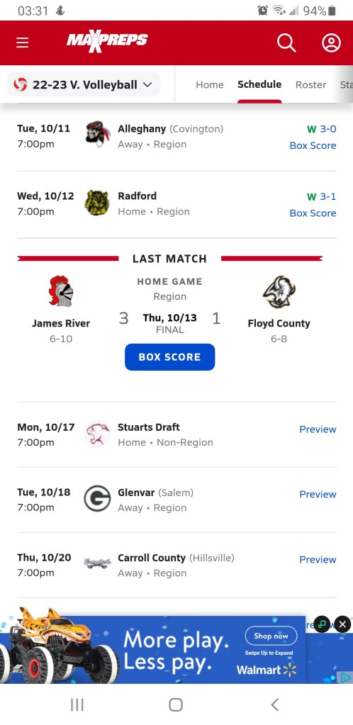 Glenvar and Carroll County moved their match scheduled for tonight was held last night π so that left a gap on the Calender for tonight so its Alleghany at Radford as a fill-in. CCHS has faced both schools one time already with the rematches slated for the next two weeks.