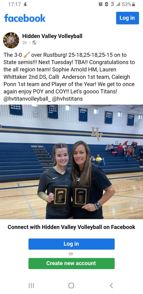 Hidden Valley continues chase of a Perfect Volleyball season after capturing the Region Championship. Sweeps Rustburg and will host on Tuesday night π Around the Valley in 60 Days Carroll County High School November 12, 2022February 3, 2023 1 Minute Glenvar from tthe District and Hidden Valley from the Region continue to chase the Dream Hidden Valley will head up I-81 on Tuesday night to play at Fort Defiance. Share this: Click to share on Facebook (Opens in new window) Facebook Click to share on X (Opens in new window) X Like Loading... Related Published by Around the Valley in 60 Days Trying to find Positive in a World π that needs more of it! View all posts by Around the Valley in 60 Days Published November 12, 2022February 3, 2023