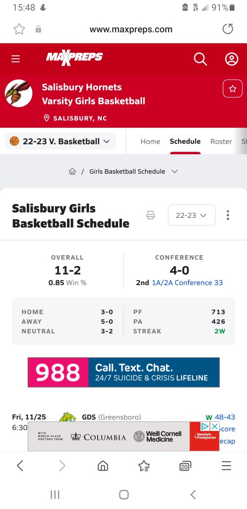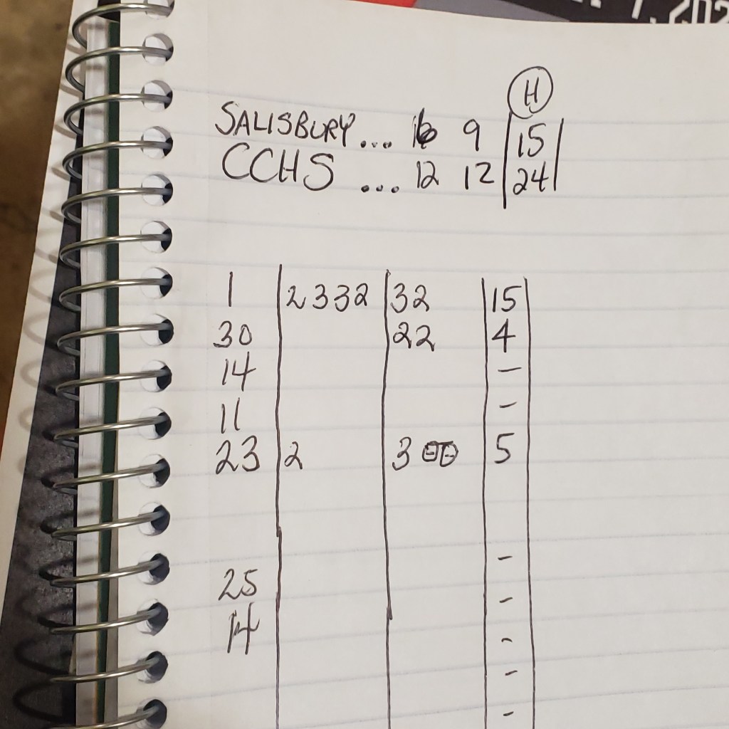 While the crowd is somewhat small its rather vocal and is reacting to every call as well as every perceived non-call. Salisbury Head Coach Drew a technical foul on the way to the locker room. CCHS should be shooting free throws to start the quarter.
