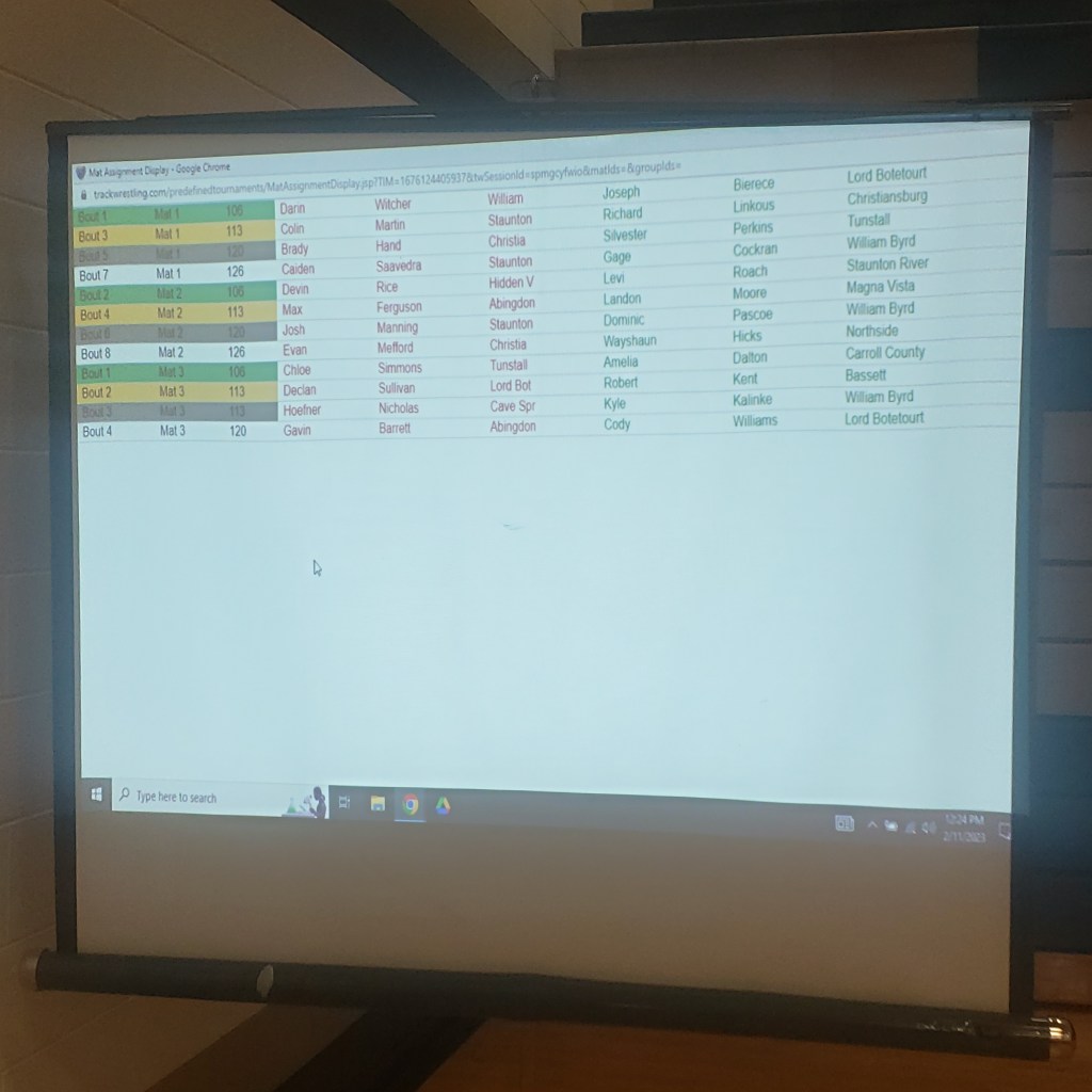 Round 1 is complete now at 10:25 and there will be a 15 minute break until 10:40am. Great news for the Cavaliers is that all seven of our Wrestlers advanced to the Quarterfinals with a Bye in each of the matches.