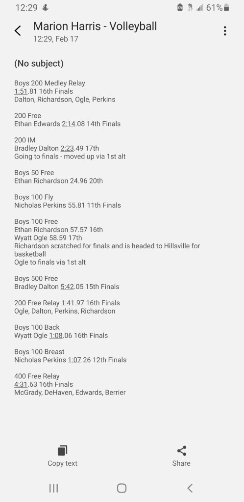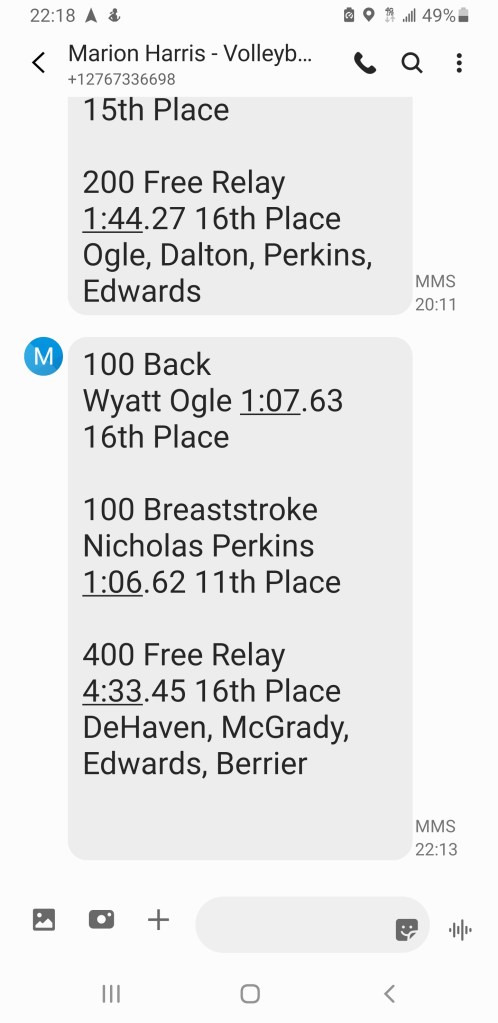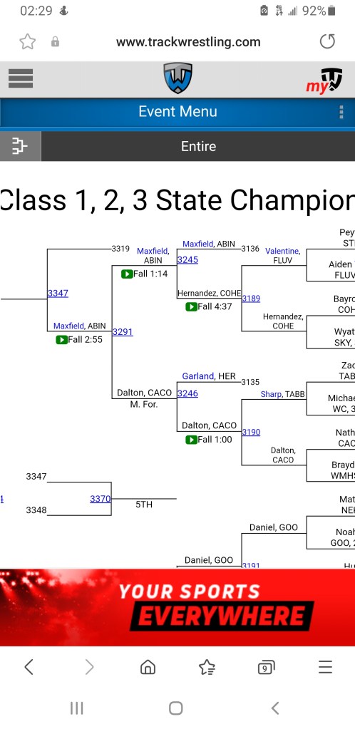 It’s now 10:00pm so its a good time for an update – I know that the Basketball 🏀 is covered and I believe that the Swimming 🏊♂️ is covered so what we have left is 2 wrestling Match results.