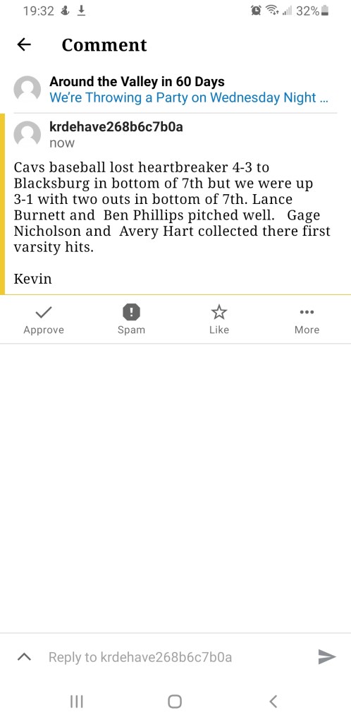 Cavaliers Baseball ⚾️ battles to the end before falling 4-3 @ Blacksburg Around the Valley in 60 Days Carroll County High School March 20, 2023 1 Minute Coach – Thanks for checking in to report the score! Sounds like your team gave you a pretty solid effort. Share this: Click to share on Facebook (Opens in new window) Facebook Click to share on X (Opens in new window) X Like Loading... Related Published by Around the Valley in 60 Days Trying to find Positive in a World 🌎 that needs more of it! View all posts by Around the Valley in 60 Days Published March 20, 2023