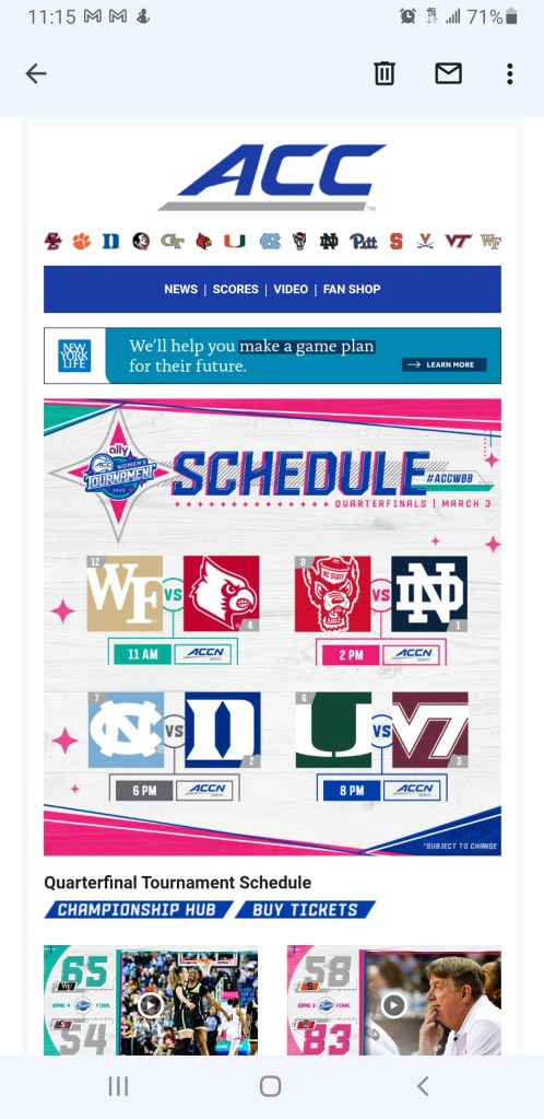 Being its only 6am and everyone has to stay productive for the next 12 hours, I will head back down to Greensboro now for Day 3 of the ACC Women’s Tournament. Wake Forrest and Louisville get things started followed by NC State versus Notre Dame.