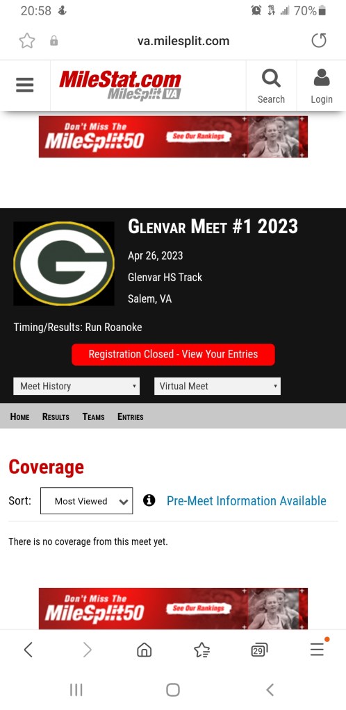 Boys π¦ & Girls π§ Track competed at Glenvar today and we have the Link to the posting site…. Around the Valley in 60 Days Carroll County High School April 26, 2023 1 Minute https://va.milesplit.com/meets/536872-glenvar-meet-1-2023/coverage#.ZEnIt-ApAwA Hopefully they will post soon ! Share this: Click to share on Facebook (Opens in new window) Facebook Click to share on X (Opens in new window) X Like Loading... Related Published by Around the Valley in 60 Days Trying to find Positive in a World π that needs more of it! View all posts by Around the Valley in 60 Days Published April 26, 2023
