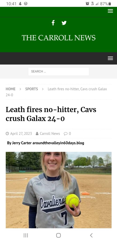Alan has posted the Story from last night’s game so I present it to you…. Around the Valley in 60 Days Carroll County High School April 27, 2023 1 Minute Leath fires no-hitter, Cavs crush Galax 24-0 Share this: Click to share on Facebook (Opens in new window) Facebook Click to share on X (Opens in new window) X Like Loading... Related Published by Around the Valley in 60 Days Trying to find Positive in a World π that needs more of it! View all posts by Around the Valley in 60 Days Published April 27, 2023