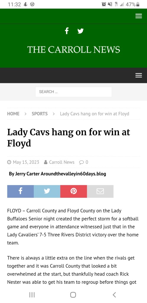 Game Story on Fridays Softball victory @ Floyd Around the Valley in 60 Days Carroll County High School May 15, 2023 1 Minute Lady Cavs hang on for win at Floyd Lady π© Cavaliers play 2 games tonight at Cavalier Park. First Pitch tossed at 5pm Share this: Share on Facebook (Opens in new window) Facebook Share on X (Opens in new window) X Like Loading... Related Published by Around the Valley in 60 Days Trying to find Positive in a World π that needs more of it! View all posts by Around the Valley in 60 Days Published May 15, 2023