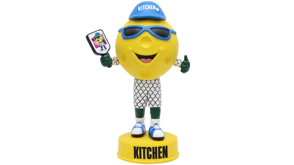 Wearing sunglasses on his pickleball-shaped head, Kitchen is also wearing a pair of shorts with a net design and a blue cap with his name and a pickleball paddle across the front. The bobblehead, which will be individually numbered to 2,023, is only available through the National Bobblehead Hall of Fame and Museum’s Online Store. The bobblehead, which is expected to ship in November, costs $30 each plus a flat-rate shipping charge of $8 per order. The Pickleball Bobble is the newest addition to the first-of-its-kind Sports Ball Bobble Series and joins previously released balls for baseball, basketball, football, golf, hockey, soccer, and tennis that all bobble. The Pickleball Bobble is on a base that is a replica of a pickleball court. “Pickleball” is featured prominently in big, block letters on the front of the base. Each bobble is individually numbered to 2,023 and they are only available through the National Bobblehead Hall of Fame and Museum’s Online Store. The bobbles are $25 each plus a flat-rate shipping charge of $8 per order. Designed by Melvin LeBlanc, Kitchen made his debut appearance at the Association of Pickleball Players Casa Grande Pickleball Open in December 2021.