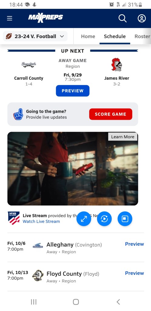 Varsity Football will become Road Warriors for the next three Friday nights π……