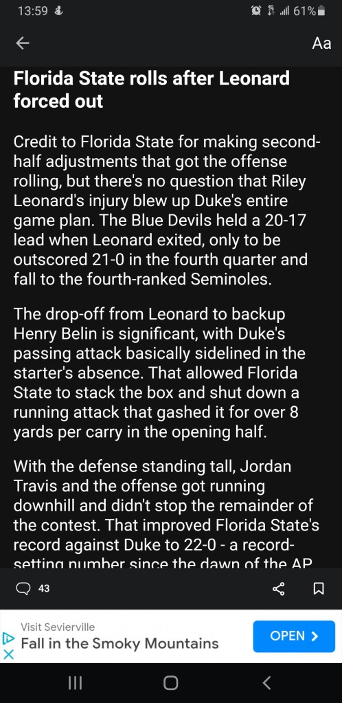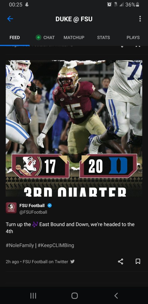 While I was sharing the moment of the Victory with Chris the game in Tallahassee changed on a dime. Duke had pitched a 3rd quarter shutout against a team that had scored 30+ in 12 straight games. Seven of the 17 came against the special teams and it was looking like a Program Changing Victory was within grasp. Florida State couldn’t stop our run game because they couldn’t stuff the box while Riley Leonard was playing QB.