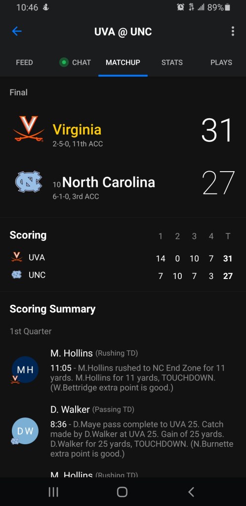 Back to Coach Tony Elliott and the Cavaliers program, what a victory this one is! By far the most significant W in his almost two seasons by a wide margin. Most casual Fans of the game will see the final score and immediately figure that the Tar Heels laid an egg π₯, that they fell into a “Trap” while looking ahead.