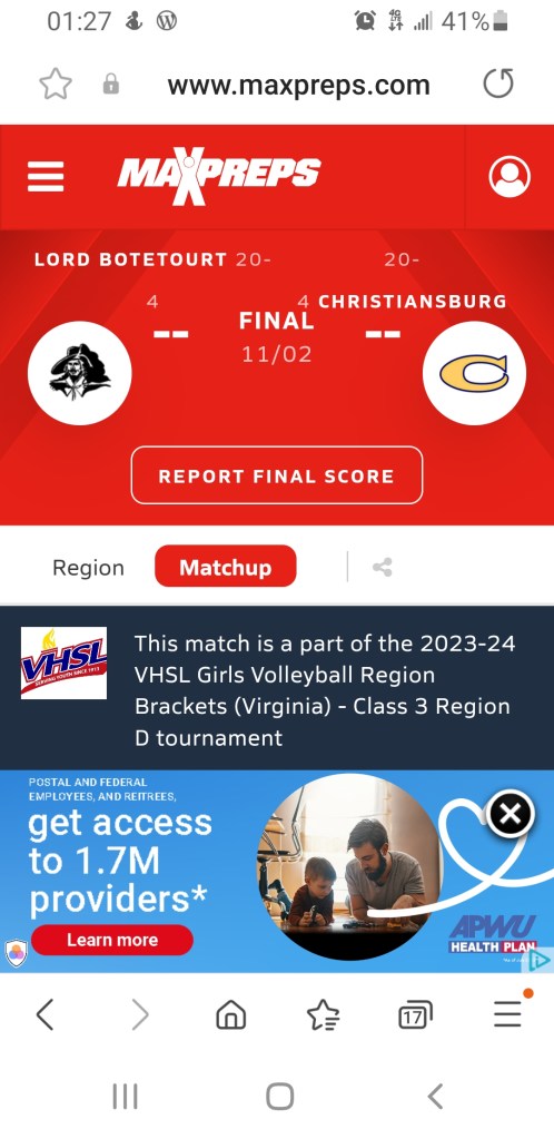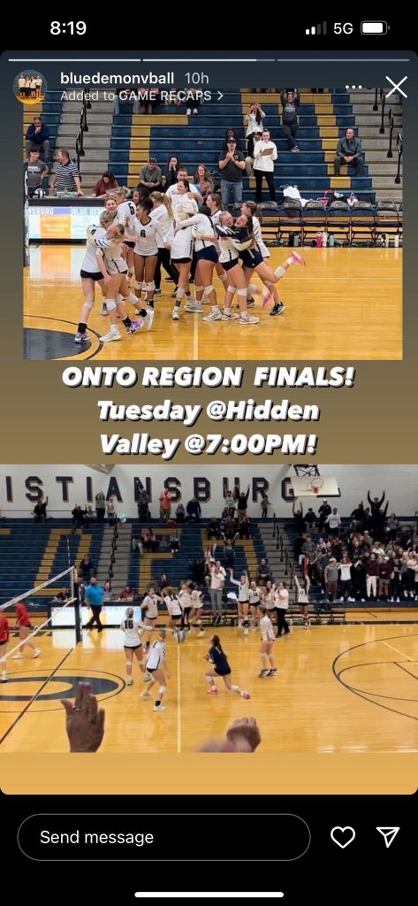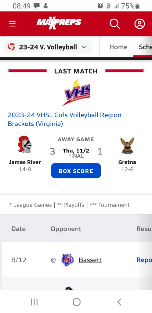 Our District is down to just James River now after Glenvar fell last night 🌙 in 5 Sets over in Appomattox but our Region has two of the eight spots and our Neighbors in Riner are looking for a Four Peat.