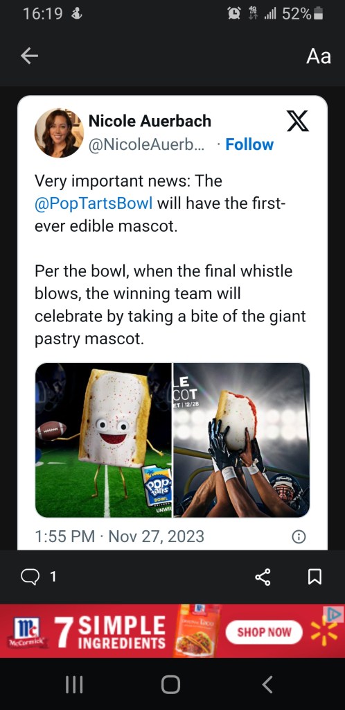 My favorite time of the Year is the College Football πππ Bowl π₯£ Season and today’s announcement just made me laugh out loud. The lead sponsors to these 41 games changes from time to time and this year Pop-Tarts is back in the mix !