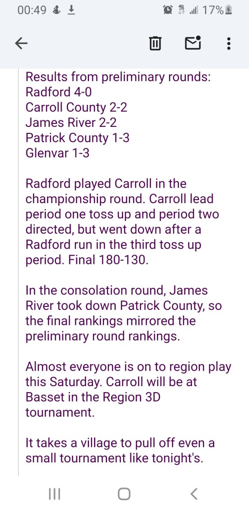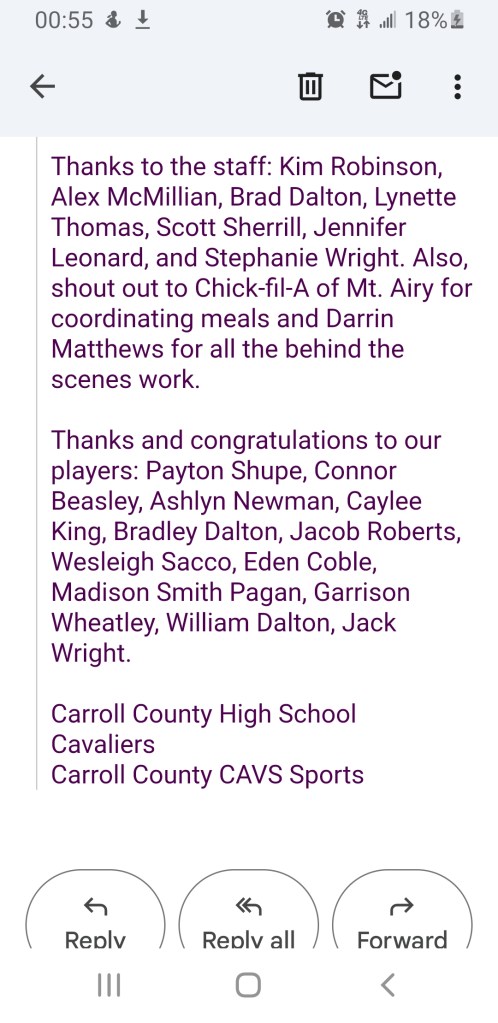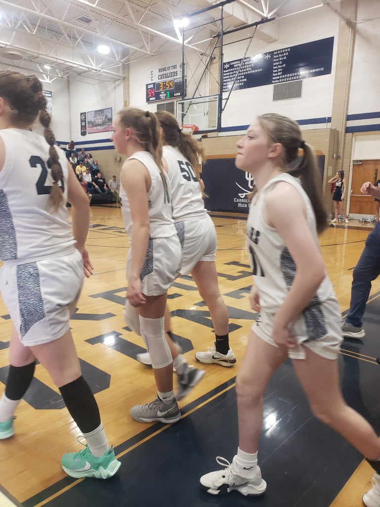 The example for saying they wore them down is this – 3:16 on the clock ⏰ and the score was 65-59. Using my limited Math skills that means we closed on a 13-2 run 🏃♂️ against a talented and well coached ball club. Glenvar was trying to get to the Finish Line of a Marathon and our groups defense coupled with their energy took a close game and made it look like a blowout.