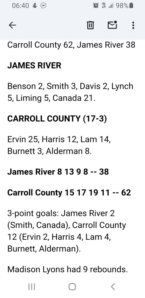 βThe entire season has been about the team gaining more and more confidence in each other and in their teammates. Last night was quite possibly the most balanced victory of the season. The lead was at 59-32 late in the fourth quarter before James River closed out the game with a mini flurry.