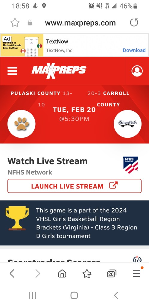 Thursday – The Carroll County High School Varsity Girls Basketball team is slated to play their Region Semi-final at 4pm up in Blacksburg at Virginia Tech. This game is dependent upon CCHS capturing its game on Tuesday night π. A victory on Thursday night would advance the team to the State Tournament once again.