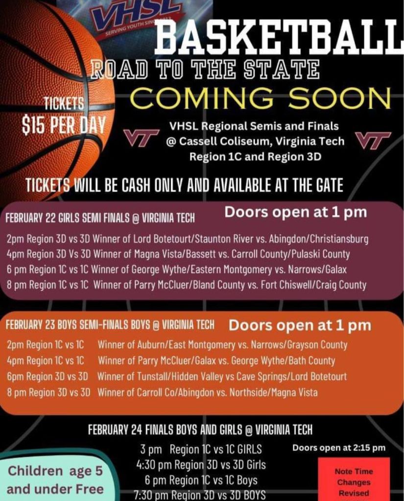 The highly decorated flyer tells us about all of the Hoops that will be played this Thursday, Friday and Saturday up at Virginia Tech. It also tells us to bring cash πΈ with us if we want to get inside Cassell Coliseum.