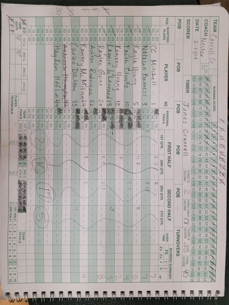 ββCarroll County – Hayden Jackson 12, Dane Leonard 10, Trace Reavis 6, Colton Gravley 6, Blake Reed 4, Landon Kinder 2, Landon Phillips 1.(41).