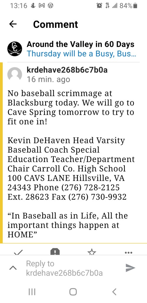 Coach DeHaven will try and squeeze in some time on the Diamond π tomorrow for his baseball βΎοΈ team and if he’s successful we hope to hear π about it later.