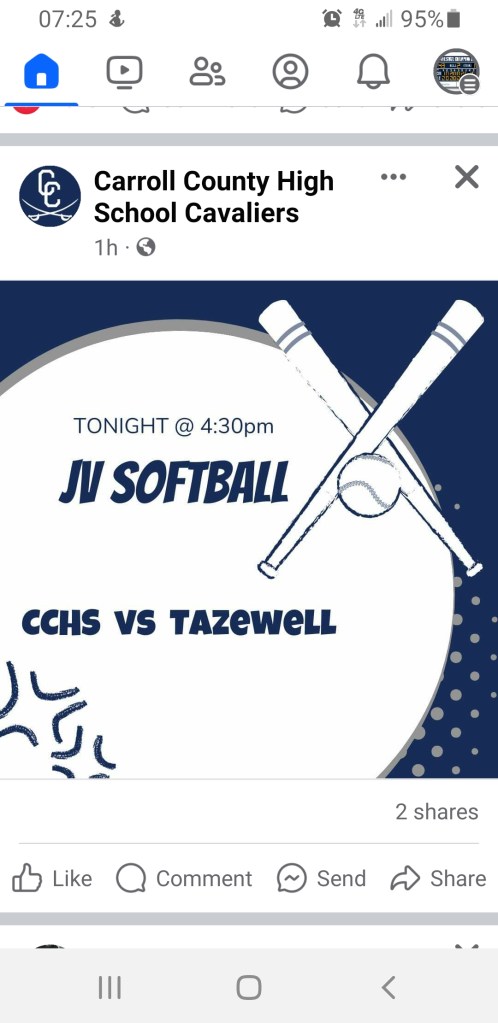 Our Junior Varsity Softball team had a double header scheduled for Monday afternoon that was moved to today at 4:30 pm. Alexis Dalton and Company will be playing two games (5 innings) against Tazewell High at Cavalier Park.