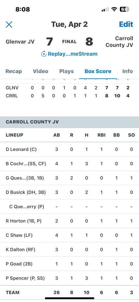 Glenvar battled back from a 5-1 deficit by stringing together five straight hits, including the Home Run from Spence before Carroll County scratched out what prove to be the winning run.