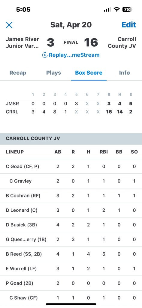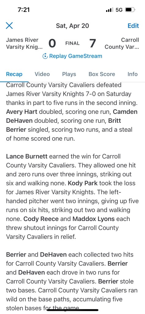 Varsity Baseball βΎοΈ followed up with a victory of their own. Still hoping to hear a out it from Coach DeHaven π