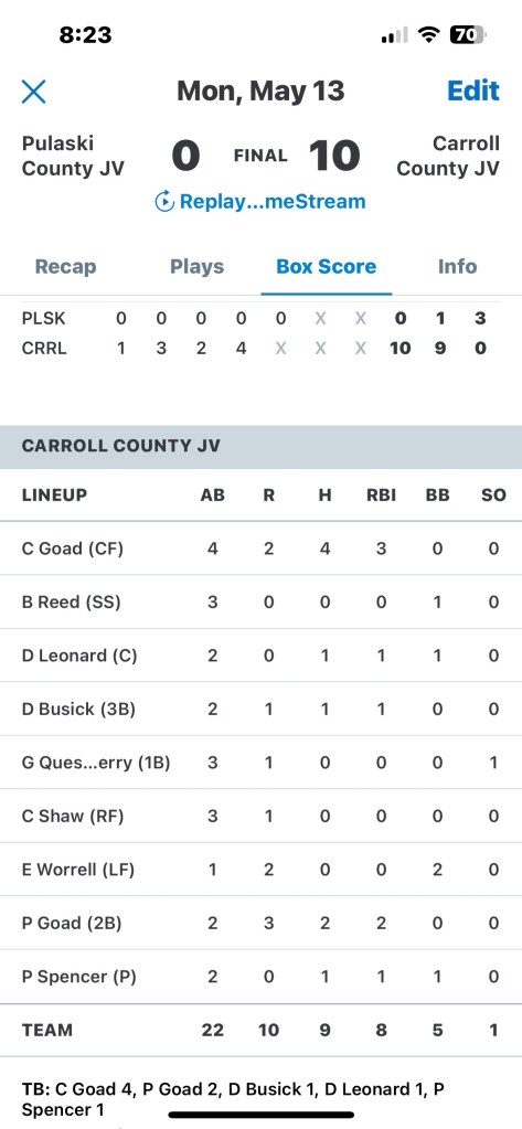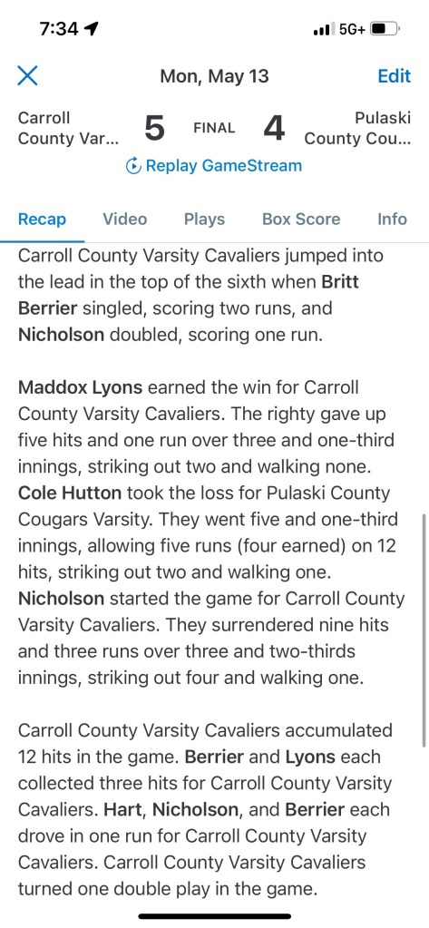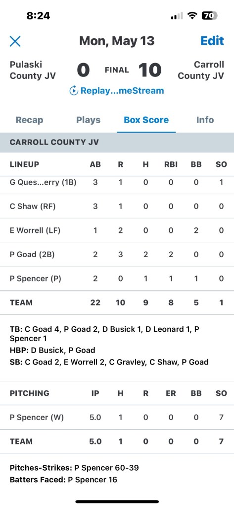 ” Come from Behind win at Pulaski today. Down 4-2 in top of the 6th and scored 3 runs. Pitching and defense held strong when we needed it.”