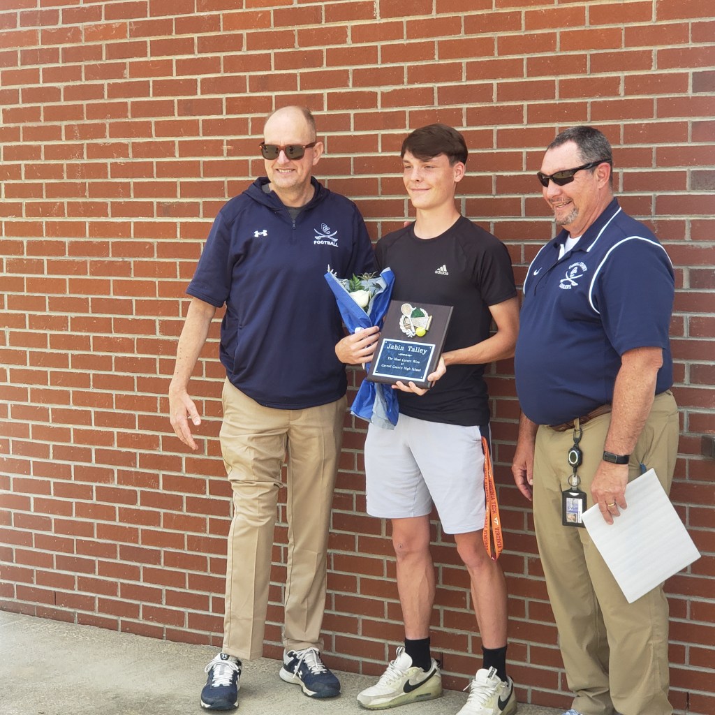 Principal Chuck Thompson and Athletic Director Darrin Mathews presenting Talley with a plaque and a Rose πΉ in honor of his four years of competition for Carroll County High School.