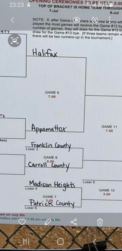 Carroll County is slated to play in an elimination game at 5:00 pm today or thereabouts. The start time for yesterday was pushed back due to some much needed rain π§ and ended just before 11pm. Best case scenario had the group back in Farmville just before Friday night turned into Saturday morning.