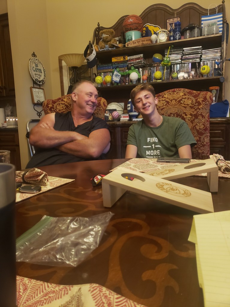 Taking a minute to break the ice π§ before sitting down and diving into a life changing journey, Kris and Ethan agreed to square off in a game of Table Top Corn Hole. Ethan raced out to a quick 10-0 lead but Dad π¨ would rally back for the victory.