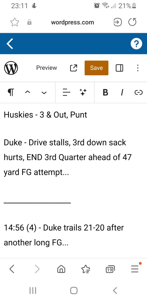Safely made it from Life Surge in Charlotte to Wallace Wade Stadium 🏟 in Durham and will be creating Posts 📫 in between plays of the Duke – UConn game. We are 16.5 point favorites which happens once in a Blue Moon 🌙.