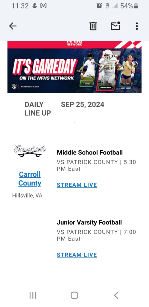 Out of Town Scoreboard still has Ferrum Volleyball π Bluefield Soccer β½οΈ on it for tonight.