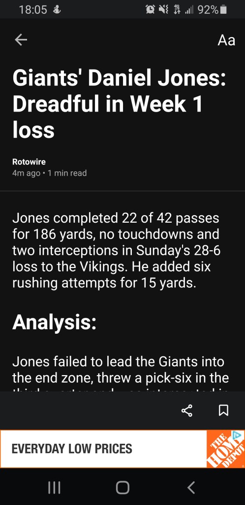 Jones worked his way up to the point where he led the Giants to a playoff victory and then the team offered him a 4 year, $160 Million Dollar extension. Now people who had been critical of him but had to slow down some, reloaded and its open season again. None of this keeps me from pulling for a young man that nobody wanted.