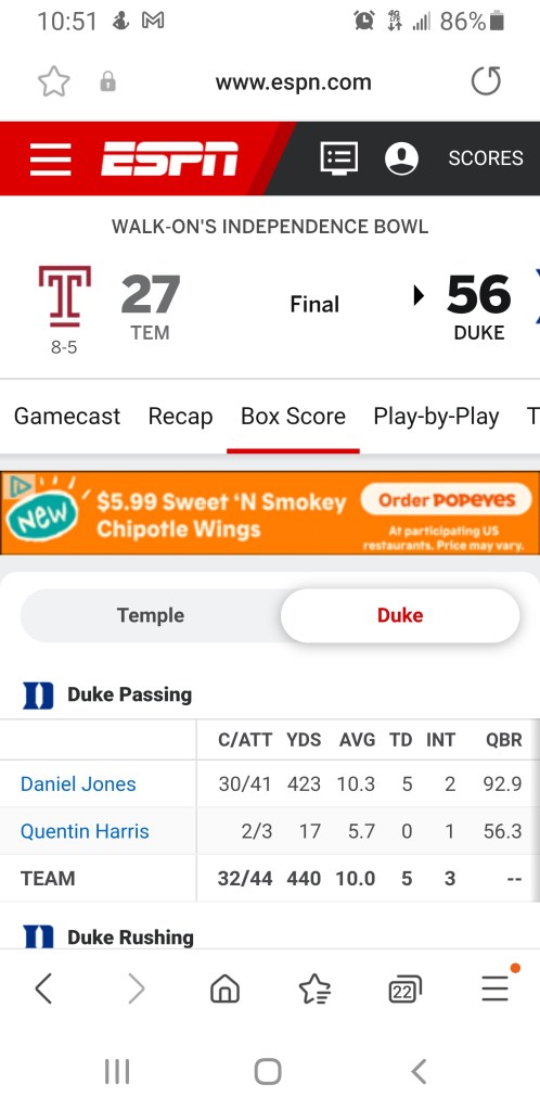 Back to Danny Dimes, his time at Duke was a roller-coaster 🎢 ride that included getting intercepted by a Bronco Mendenhall coached UVA team six times in one game. Jones continued to battle hard and he was being coached by the same man that mentored both of the Manning Brothers during their college careers.