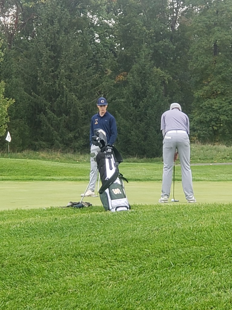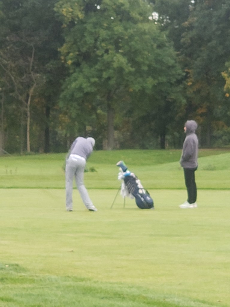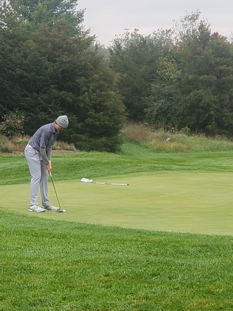 Rain is trying to let up as Trace is facing his first sign of trouble. Delicate chip stays in the tall grass. Lengthy putt for Bogey was dead on line but horseshoed out. Double Bogey after 7 pars.