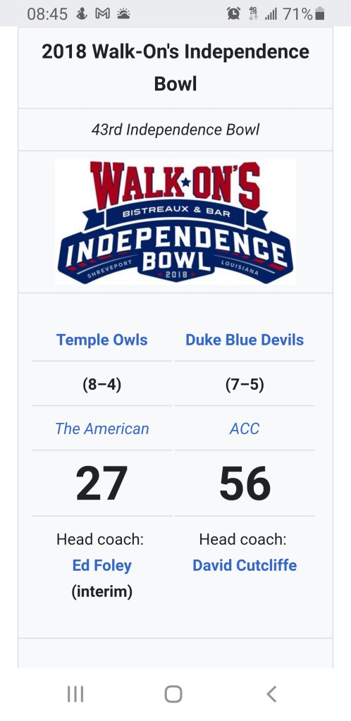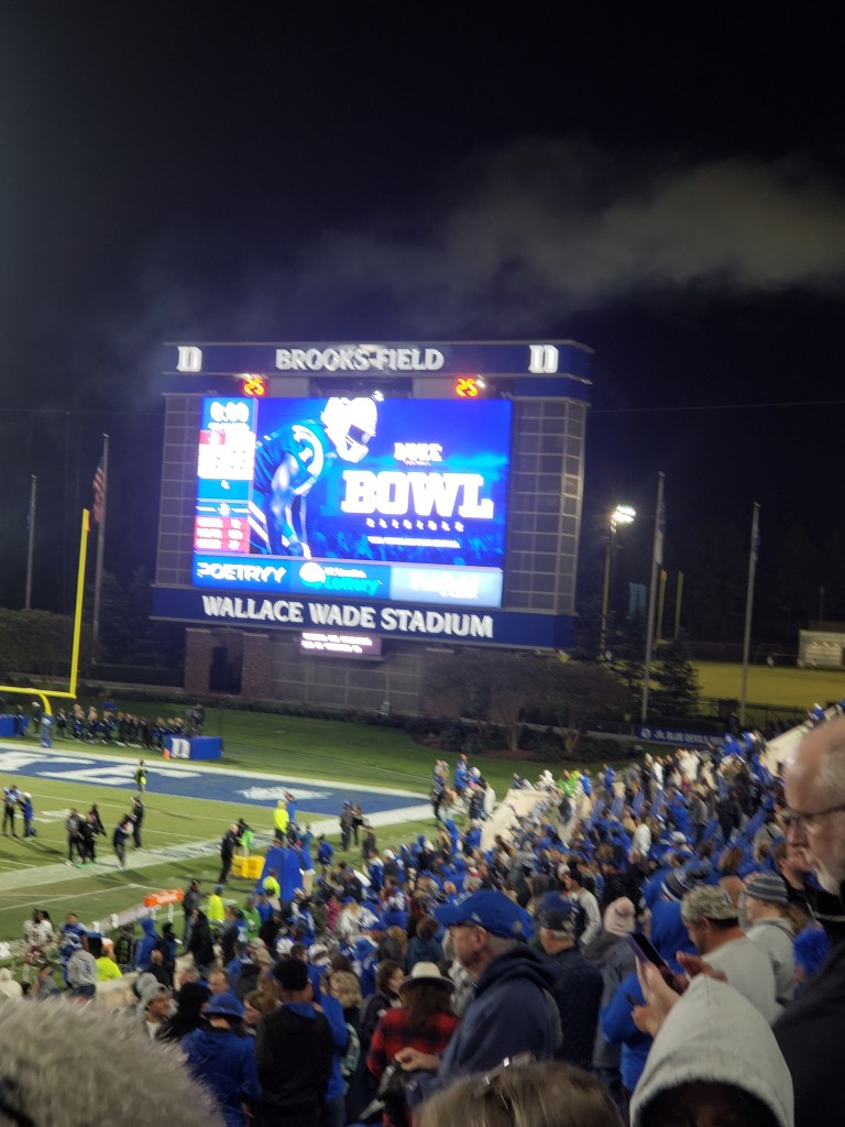 The following year we made it four straight and this time it was just Alan Knight and myself that headed to Yankee Stadium 🏟 to play Indiana University. Another dismal weather day but something happened at the age of 52 – Duke won a Bowl Game !!!