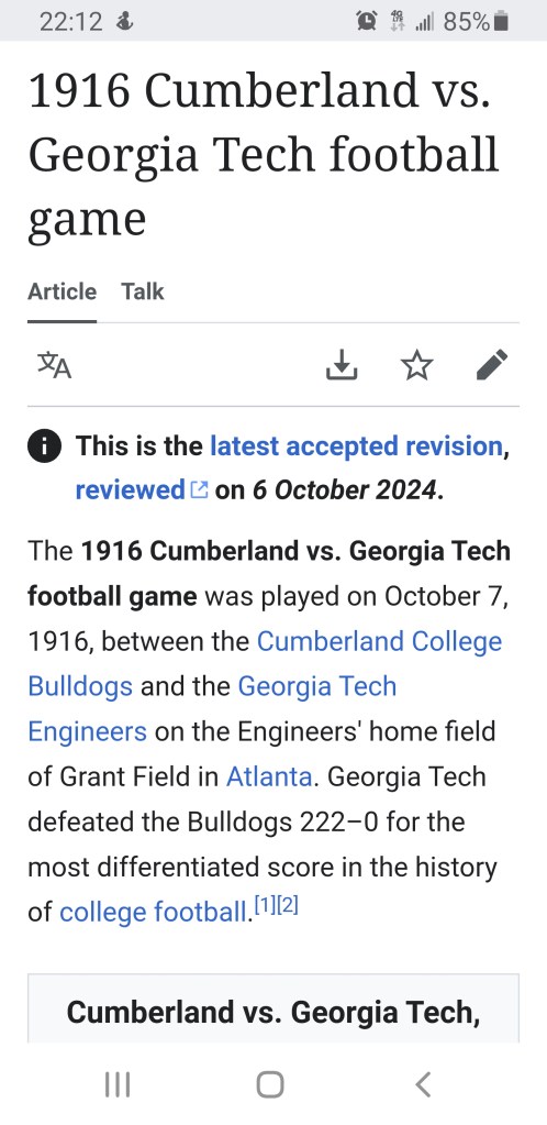 I remember reading about a football game where the final score was 200+ to zero and the losing team was from where my Mother π© was born 19 years later.