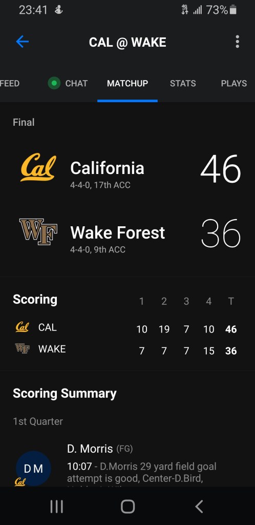 Still get to see the 4th quarter of an exciting Cal versus Wake game !