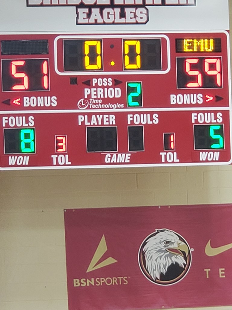 4:40 pm – Half-time, Greensboro 35, EMU 33 – 15:00 on the Clock β°…