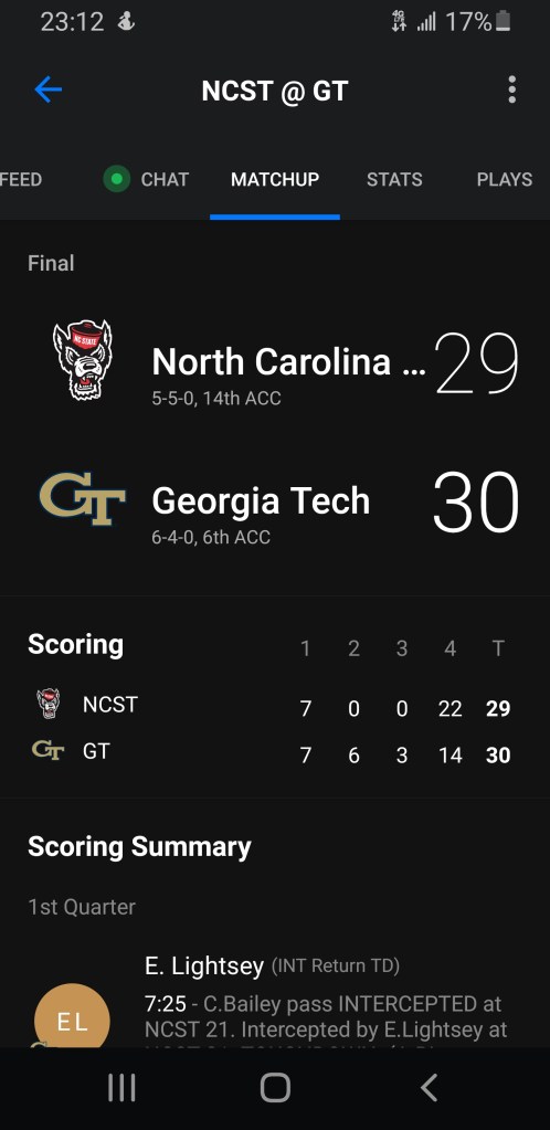 NCSU – 3rd interception on the night π, at 6:44. GT scores on 1st play to make it 23-14. πΊ defense has played great but their offense has given up 14 points (6:40). Looks like the πΊ will need to defeat UNC next weekend to make it 6-6.