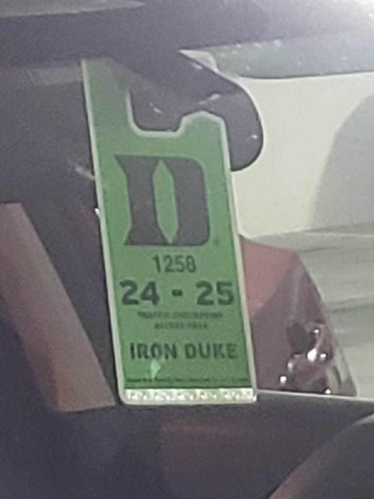 Marion really liked how his car π looked with an Iron Duke Parking Pass hanging in it.