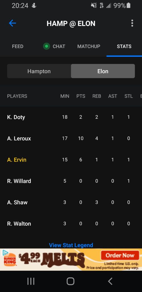 The 15 minutes of playing time in a contested game might be the most relevant number on the sheet as Ervin continues to work her way onto the court. Elon (8-6) will return to action π¬ next Friday (1/17) when they host Stony Brook