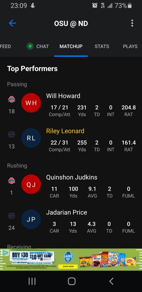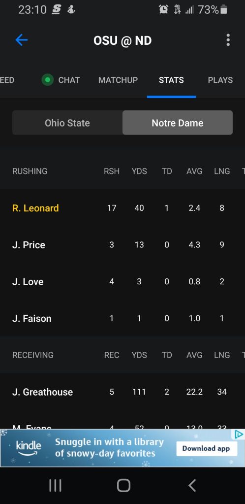 I have no ties to Notre Dame other than Leonard and the fact that its easy to pull for Freeman. At this point OSU has scored on four straight drives and I don’t see it slowing down in the remaining 27 minutes.