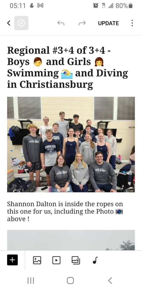 The need to go to the School to gather information about the Scholastic Bowl was created by the fact that Mrs. Dalton was heading to Christiansburg for the Swimming πββοΈ Regional. Shannon does a terrific job getting me information on the Academic side of CCHS.