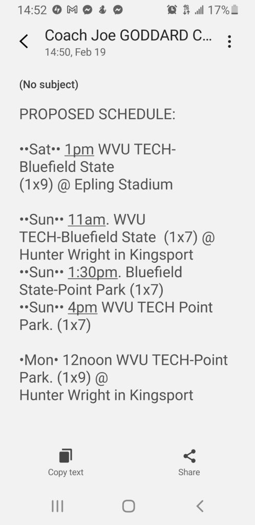 The snow β is starting to fall here and its my hope that the Junior Varsity team gets one more opportunity to play ball this year. The weather will be the deciding factor in regards to Thursday night at Radford.